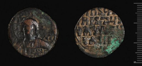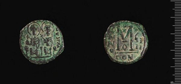 Curator: This is a fascinating artifact, a Coin of Justin II, currently residing at the Harvard Art Museums. Editor: It appears timeworn, a sort of verdigris patina lending it an air of solemn antiquity, yet the designs still possess a tangible geometry. Curator: Coins like this served not just as currency but as potent symbols of imperial authority and Byzantine identity. Editor: Indeed, the formal rendering of the emperor's visage on one side, juxtaposed with the Christian symbol on the other, creates a striking dialectic. Curator: It speaks volumes about the intertwined nature of the Byzantine state and the church during Justin II's reign. Currency was carefully regulated and used to spread a very specific message. Editor: Looking at it, I'm compelled by its tactile quality, even in its current fragmented state, offering a material connection to a distant era. Curator: Precisely, a touchstone to understand the political and cultural landscape of its era. Editor: Yes, a reminder of the tangible nature of even the most abstract powers.