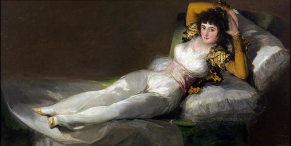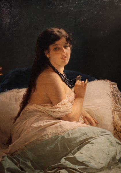 Editor: Here we have "Traviata" by Gabriel von Max, made with oil paint. The scene feels very intimate, almost voyeuristic, capturing this woman in what seems like a moment of illness or vulnerability. What’s your take on it? Curator: The material choices tell us a lot. Oil paint itself, developed in the early modern period, facilitated this illusionistic representation. The texture he achieves gives a hyperrealist quality to the lace, the fabric of the dress, and even the woman’s skin. It almost romanticizes consumption, doesn't it? This work and others like it were luxury goods produced and consumed by a very specific demographic at the time. Editor: Consumption in what sense? I was thinking more about the artist's intent or the story behind the image... Curator: Think beyond intent. Consider the economic conditions that made this kind of artwork possible. Someone had to afford to commission or purchase it. What kind of labor went into producing the oil paints, weaving the fabric depicted, even growing the roses? How does it reflect a societal structure of luxury and suffering being represented as part of one transaction? Editor: That’s an interesting point – that everything down to the paint and fabric contributes to the overall reading of the work in the context of production and consumption. Curator: Exactly. By looking at the means of production, the types of materials, and how they are consumed, we gain insight into a far broader cultural picture. It makes us reflect on the artist's place within all that, and his patrons as well. Editor: I've definitely never thought of Romanticism in such stark, material terms! This helps put everything into perspective, and allows me to reflect on art’s history and also my perspective on it in a new way.