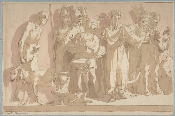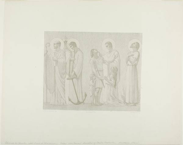 Curator: Welcome. We are standing before James Ensor's 1888 etching, "De zilverling van Caesar," which translates to "The Silverling of Caesar." Editor: My first impression? It’s like peering into a half-remembered dream, all faint lines and blurry edges. The figures seem to emerge from the aged paper itself. Spooky! Curator: That dreamlike quality resonates with Ensor's Symbolist leanings. The work uses etching, giving it that distinctive scratchy texture. Note the title. It evokes a critical juncture where power meets morality, specifically through economic exchange. It begs the question: who is complicit in this transaction? Editor: Ooh, a power play wrapped in ancient robes! But look at the faces, some seem almost… cartoonish, exaggerated. It feels cynical. Are we supposed to take any of these figures seriously? Curator: Precisely. Ensor often employed grotesque imagery to critique social norms and expose hypocrisy. "The Silverling of Caesar" reflects the artist's broader preoccupation with religious and political corruption. The exchange of money suggests betrayal and questions the validity of secular and religious power. How do such scenes reflect our current understanding of ethics, politics, and financial entanglement? Editor: So, not just a historical snapshot, but a timeless mirror. A mirror reflecting our own messed-up priorities. And hey, is that a dog down there on the right? He looks pretty unamused by the whole deal, like, “Can we go home now?” Curator: The dog is definitely a character in this silent drama! Animals were important symbolic components within artwork during this time. It underscores that Ensor used everything to amplify his narrative, giving dimension to those usually voiceless, on the margins of conversations of power. Editor: It makes me wonder what Ensor was truly mad about, you know? Was it the specific biblical story, or something he saw happening around him in 19th-century Belgium? Probably both, huh? Curator: Definitely. By situating it within that specific historical context, we are able to extract contemporary issues relevant to our present-day society, to facilitate an intergenerational dialogue with James Ensor. Editor: It’s a bit unsettling to think some things just… don't change. Curator: Yes, Ensor gives us a scene to reflect upon again and again. It's a perfect summation of those recurring historical themes. Editor: Okay, Ensor, message received. Loud and clear. Or maybe, whispery and suggestive… Either way, thanks for making us think!