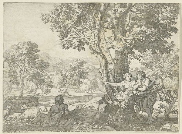 Editor: We are looking at Franciscus de Neve’s etching, *Landscape with Shepherds and a Dog*, created between 1660 and 1666. I'm really drawn to how detailed the etching is; it feels almost photographic in its clarity, even though the scene depicts an idealized landscape. How do you interpret this work through its historical context? Curator: Well, first, the Baroque period loved drama. What's interesting here is its subtle participation. Consider where and for whom de Neve might have produced this etching. Given the figuration with classical imagery in an idealized landscape, the location where it was made, and the Baroque style, it likely served a function for a wealthy patron. It wasn't meant to be mass-produced or widely disseminated, but more than likely commissioned as a collector's item for someone within a privileged class that wanted to display the kind of "classicizing" culture that they adhered to. How does the composition itself reflect this? Editor: The way the figures are posed does resemble classical sculptures. I hadn't really thought about how the imagery would influence its meaning! Curator: Exactly! These details would signify refinement, education, and engagement with classical ideals—important markers for status and cultural capital during that era. The figures reclining so serenely is clearly meant to highlight this patron’s cultivation of aesthetic refinement. How do the dog and livestock play into this idyll? Editor: Hmm, are you suggesting the inclusion of everyday imagery romanticizes aspects of labor and property? Curator: Precisely! And think of this from a power dynamic: who is creating this scene, and for whom? And what kind of statements does the patronage of art serve? Editor: That’s fascinating. So much of the image is a signifier beyond its face value. It encourages a much deeper analysis! Curator: Right, it gives us an insight into the complex interplay between art, power, and societal values of the time. It’s less about nature, and more about the social aspirations tied to it.
