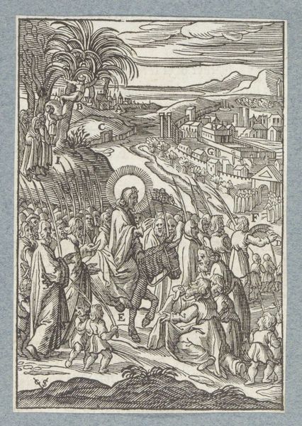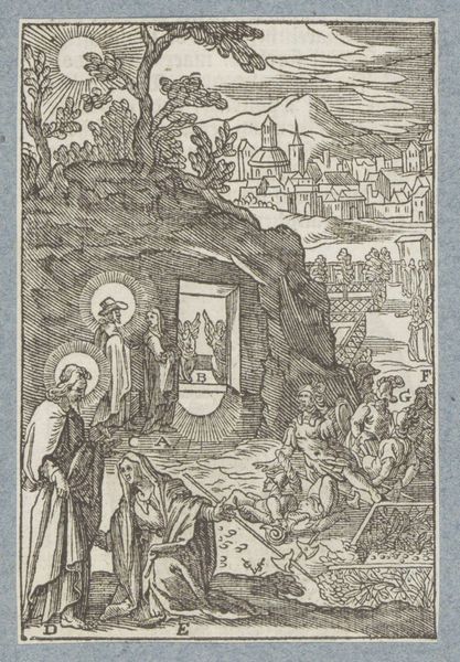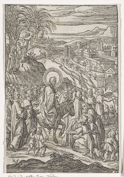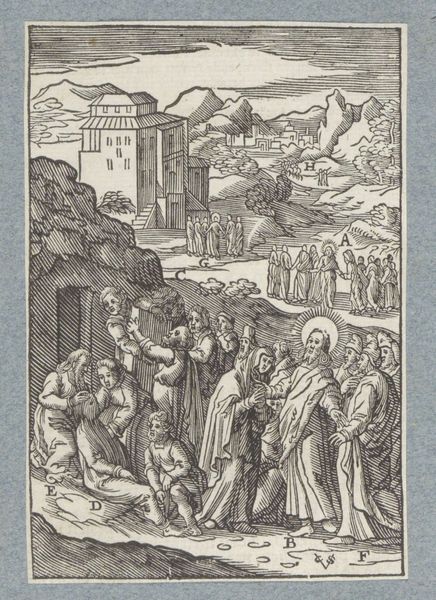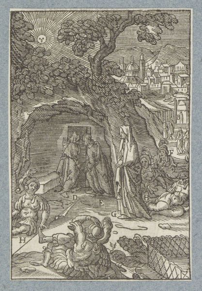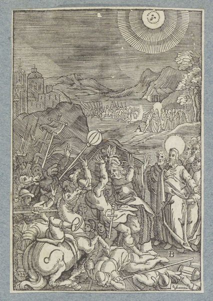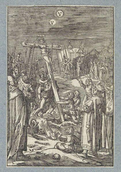 Curator: Let's focus on "Christus wordt aan het kruis genageld," or "Christ Nailed to the Cross," a compelling engraving created by Christoffel van Sichem II in 1629. What’s your first reaction to it? Editor: The immediate impact is one of stark violence, all rendered through incredibly precise line work. The cross looms large, an instrument of torture taking center stage. The busyness of the scene almost makes it feel frantic. Curator: Precisely. The engraving technique itself— the way he meticulously carves away material to create these lines— reflects the labor and the deliberate nature of both artistic creation and the depicted crucifixion itself. It draws parallels to other trades of the time like woodworking. It's no accident this image circulated widely as it's a reproducible commodity intended for widespread consumption. Editor: Yes, but look at the symbolism packed in. The two, somewhat anthropomorphic, suns above seem to bear witness, suggesting cosmic significance and even divine judgment, beyond just the human participants present. What do they represent? How do they fit within Christian iconography of the period? Curator: I agree, the almost comic-like suns lend the scene additional gravitas and remind viewers of God’s looming judgement and control. Consider too the contrast: a relatively inexpensive printed image displaying extreme luxury afforded to the ruling classes during times of severe religious conflicts and high rates of labor across Europe. Editor: But focusing on religious symbology for a moment, consider the INRI inscription—it’s presented so prominently. And the placement of Christ among common soldiers creates an intentional statement on martyrdom, power, and obedience, no? Curator: The engraving certainly creates a memorable religious image. However, remember the socio-economic realities underpinning art production, like the printing press itself, which are often overlooked. Art doesn’t just symbolize power, it relies on the power to purchase and display these symbolic visual images in order to shape the ideas that proliferate society. Editor: Indeed, a vital interplay to remember and a perfect note upon which to close our conversation. Thank you for offering a lens onto material forces underlying these enduring visual icons! Curator: And thank you for helping reveal their enduring iconic power and its capacity to reach diverse viewers!