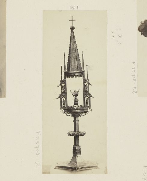 Editor: So, here we have Charles Marville's "Spire of the Chapel of College St. Dizier," a photograph from between 1862 and 1870. It's this incredible shot of a gothic spire, but it's also very sepia-toned and feels incredibly architectural and historical. How do you interpret this work, looking at it through a broader cultural lens? Curator: Marville’s work operates on multiple levels. While seemingly a straightforward architectural study, it’s also a carefully constructed image engaging with the cultural obsession of documenting and preserving architectural heritage during the Second Empire. Consider the political dimensions: these photographic surveys were often commissioned to both celebrate national identity and facilitate urban planning, which frequently involved significant demolitions and reshaping of cities. Do you notice anything about the angle or the setting? Editor: It’s framed looking slightly upward, making the spire seem monumental. Also, the soft focus in the background creates a sense of timelessness and romanticism, kind of blurring the line between a purely documentary work and an artistic one. Curator: Precisely. And how does this image, commissioned during a period of immense urban transformation under Haussmann's plans for Paris, serve as a potential act of preservation and perhaps even nostalgia for what was being lost? This spire is captured at a moment of huge change, both architecturally and culturally. Editor: I hadn't thought about it as an act of preservation, but that makes perfect sense. It almost feels like a longing for a past that’s rapidly disappearing. It becomes a statement in the midst of urban upheaval. Curator: Absolutely. It shows how something seemingly simple like a photograph of a building can be interwoven with layers of socio-political context, isn’t it interesting? Editor: Yes, definitely. It has given me so much more to think about. Thanks!