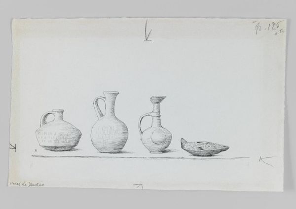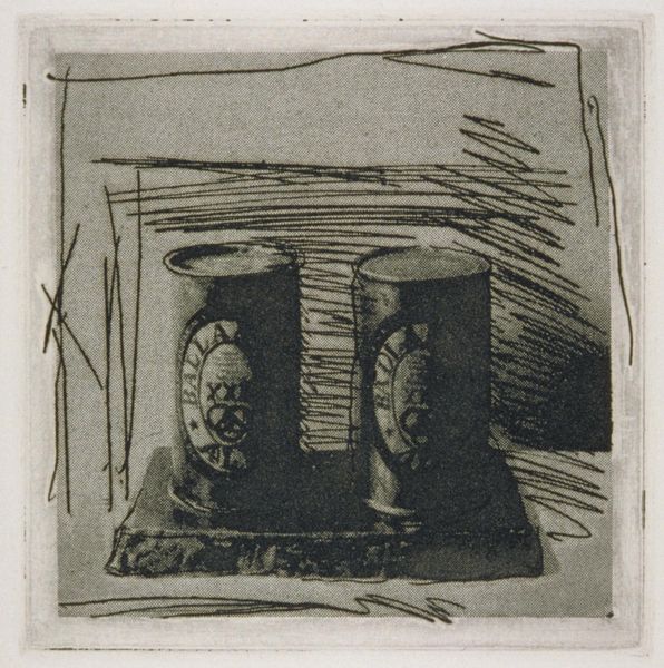 Curator: Here we have Giorgio Morandi’s "Still Life," residing here at the Harvard Art Museums. Editor: It strikes me as quite subdued. A quiet gathering of geometric forms rendered in muted tones. Almost meditative. Curator: Indeed. Morandi was fascinated by the interplay of shapes and volumes. Observe the subtle gradations of light and shadow, how the artist utilizes hatching to define each object. Editor: But what are these objects? Mass-produced bottles, perhaps? Commonplace vessels elevated through the meticulous application of line and tone? The act of making a composition matters here. Curator: Precisely. Morandi removes these objects from their everyday context, inviting us to consider them solely as formal elements. The composition supersedes function. Editor: Still, it begs the question: why these particular objects? Are they stand-ins for something more? Curator: Perhaps they simply represent Morandi's commitment to reducing the world to its essential forms, a testament to pure visuality. Editor: Or perhaps to see what we can do with so little. Both are equally valid, I think.