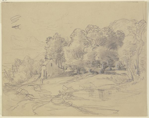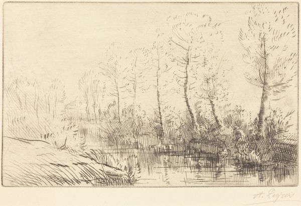 Editor: We’re looking at “Baumbestandenes Flussufer mit parallel gef\u00fchrtem Weg,” or "Tree-covered Riverbank with Parallel Path," by Franz Kobell, an ink drawing housed here at the Städel Museum. It has this ethereal quality with the light inkwork, yet feels very intentional. What structural elements stand out to you? Curator: The dominance of line, certainly. Note how the varying density and direction of the lines create texture, form, and spatial depth, all within a monochrome palette. Consider the artist's application of hatching and cross-hatching to articulate volume in the foliage and reflections in the water. Does this strike you as expressive or descriptive? Editor: I think descriptive. The texture and form feel secondary to capturing a specific sense of place, despite it not being photorealistic. It almost feels impressionistic. Curator: Observe the formal relationships between foreground and background. The path, although "parallel" according to the title, diminishes in scale, directing the eye towards a horizon obscured by dense vegetation. How does this compression of space contribute to the work's overall affect? Editor: It makes it feel both intimate and limitless at the same time. Curator: Precisely. Notice, too, the deliberate placement of the tree trunks. Their verticality is essential. How would this composition be changed if the treeline were at the Golden Ratio, emphasizing horizontal form over the verticality of these repeating trunks? Editor: I think it would lessen the depth, making it more flat. Thank you! This was an insightful look at the building blocks of this drawing! Curator: The interplay of these formal elements constructs meaning and offers new readings, it invites sustained analysis and conversation.
