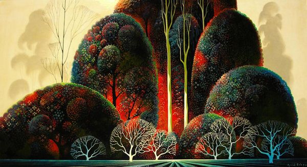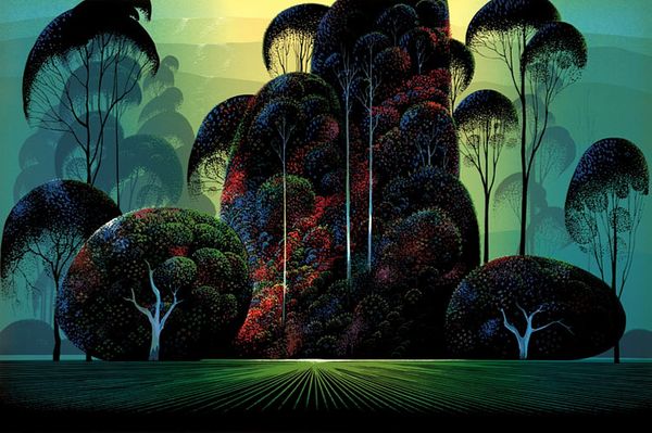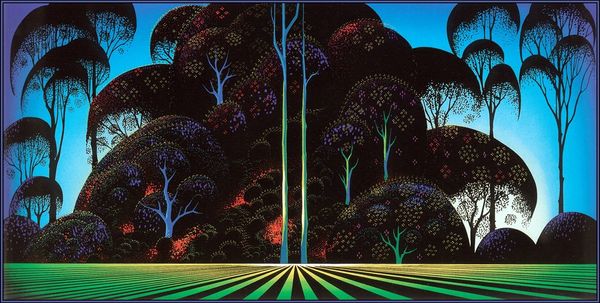 Eyvind Earle made this serigraph, or screenprint, titled "Mendocino" sometime during his career as a landscape artist. Earle's landscapes are stylized, almost graphic, a mode that was very commercially successful in mid-century America. Earle's work is interesting as a case study in the complex relationship between art and commerce. On one hand, his landscape paintings seem to take inspiration from the flat expanses and vibrant colors of California, echoing the mid-century's artistic fascination with place. On the other hand, Earle also worked as a background artist for Disney, bringing his artistic vision to a mass audience. It's worth asking whether his style, with its bold lines and simplified forms, was shaped by the demands of commercial illustration. To understand Earle’s work, one might look at the history of landscape painting, the rise of commercial art, and the institutions that exhibited and sold his work. Thinking about how artists like Earle navigated the art world can help us better understand the values and assumptions that shape our own.