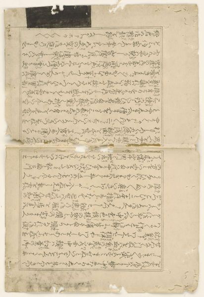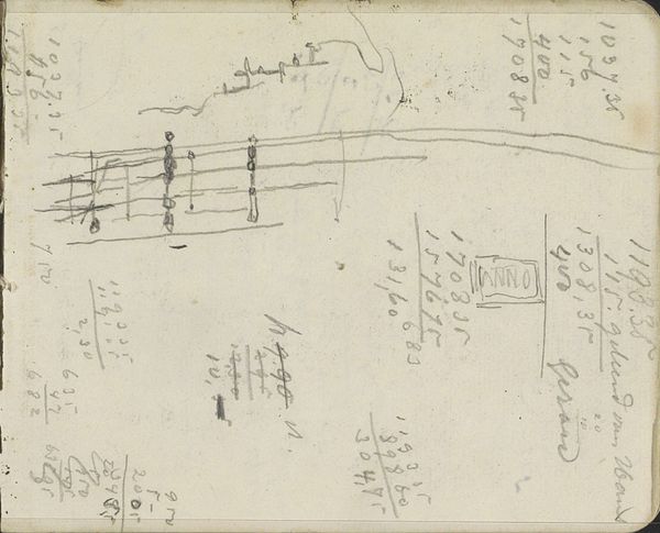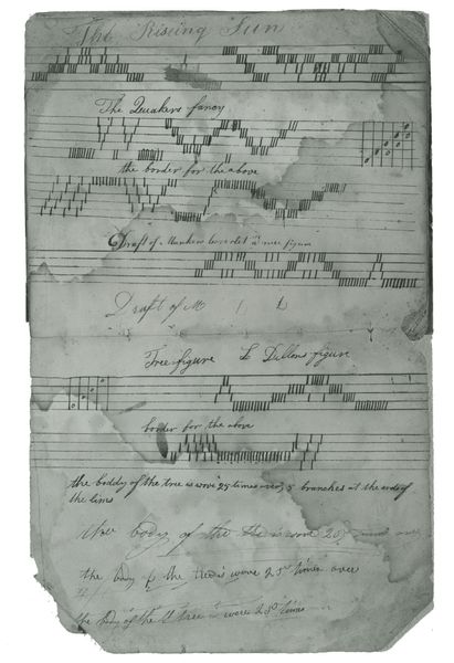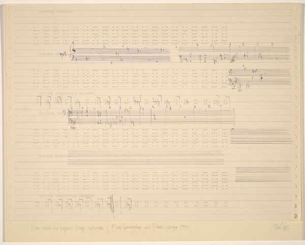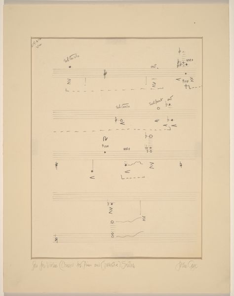 Curator: Immediately, it strikes me as both frenetic and oddly restrained. The red markings layered over the stark music staves suggest a contained chaos. Editor: Indeed. What we're observing is a piece by John Cage, specifically, it’s titled "Bassoon Chart for HPSCHD (with Lejaren Hiller)." It's a mixed media work incorporating ink and watercolor on paper. Curator: Mixed media gives him that layered effect! The use of those red lines – they’re disrupting what should be orderly rows. Semiotically, the disruption suggests dissonance and unpredictability which could reveal much. Editor: Cage’s collaborative efforts with Lejaren Hiller frequently explored the intersection of chance operations and music. Consider how computing technology, radical then, informed compositions where the final piece was largely aleatoric – determined by chance. Curator: Yes, you can certainly see evidence of the aleatoric here—the staves appear almost overwhelmed by the additional markings. Though seemingly random, the distribution and density could reflect particular probabilistic parameters implemented at the time. Editor: Absolutely. Also interesting is how these works functioned within the cultural milieu of experimental art. The pieces sought to challenge conventional notions of authorship, musical structure and presentation. Performances included projected images with multi-channel sound. Curator: What an intriguing commentary about how rigid compositional structures fail. He builds an almost entirely novel mode for approaching form and representation within sound and space. Editor: By questioning established norms of art-making, it effectively democratized composition and promoted an engagement between art and chance operations that continue to impact conceptual and media art to this day. This chart represents, quite literally, an act of artistic defiance. Curator: Seeing it with that lens, now, I appreciate the complex balance Cage manages between structure and liberation. The frenetic marks aren't chaos for chaos' sake, but controlled expressions challenging constraints. Editor: Precisely, reflecting back on this, it shows a bold experiment from a visionary, constantly questioning our understanding of creativity itself.