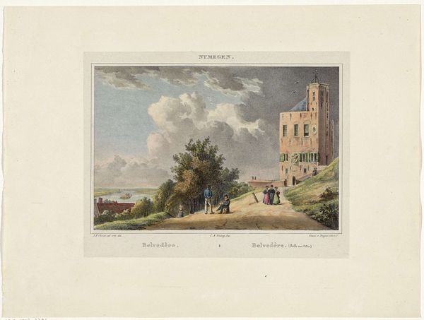 Curator: Standing here, I can't help but notice the palpable moodiness of this watercolor. There’s a storm brewing, the light is incredibly diffuse… it’s Romanticism at its best! Editor: Indeed. We’re looking at Johannes Franciscus Christ’s rendering of the Sint-Nicolaaskapel in Nijmegen. It was created sometime between 1809 and 1845, placing it firmly within the era of Romanticism. What interests me here is how Christ represents this chapel not just as architecture but as a feature within the changing landscape. Curator: And what a compelling setting! Look at the layering of forms, the way the road pulls the viewer in, and then the gaze extends to the waterways, dotted with ships on the horizon. What details of material usage stand out to you? Editor: Absolutely. The medium itself, watercolor, speaks to a culture of leisure and observation. But consider, too, how widely available paper was becoming during this time—a reflection of industry changes as well. It would also be worth understanding what role these images played for different kinds of residents and whether their meanings were shared and agreed upon, in terms of art ownership. Curator: That brings us to the people and class at the time of artwork creation and consumption! Editor: Exactly. The people out for a stroll—seemingly from middle class families out for some leisured wandering in the countryside. You see the blurring of lines here as this historical period also speaks to new forms of societal leisure and production as a whole. Curator: The loose brushstrokes of the vegetation, how they imply natural growth, not manicured. Editor: Precisely, as well as suggesting social mobility of people from different ranks. Curator: I see how both nature and the urban interact through these buildings to serve its community through different types of weather. I appreciate having had the chance to dive into this piece together. Editor: I quite agree. Considering landscape within these urban spaces opens doors for conversations.