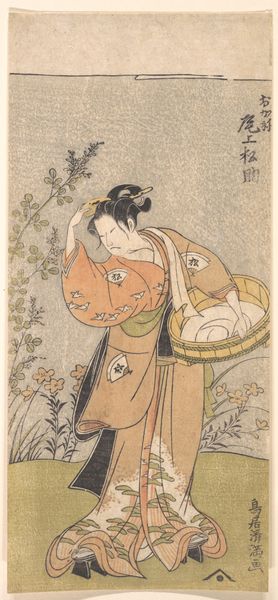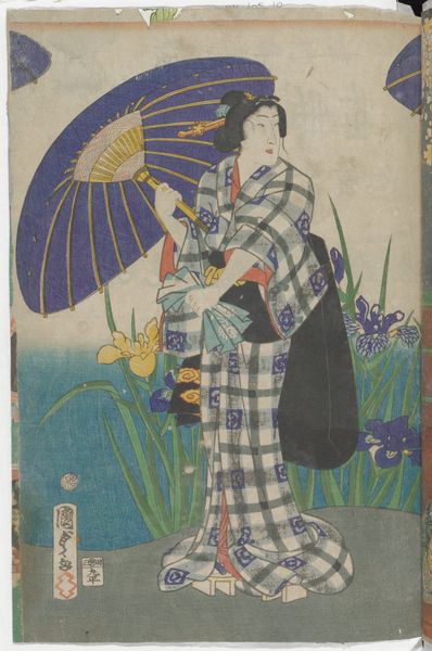Toyohara Sadatora created this woodblock print titled, "Fashionable Seven Autumn Plants" in the 19th century. The composition presents a poised figure amidst a vibrant natural setting, a juxtaposition that captures our attention. The woman’s kimono, with its intricate patterns, displays a dialogue between nature and artifice. Observe the horizontal lines of the garment against the organic forms of the flowers and water. These elements create a tension between the constructed world of fashion and the fluid, unpredictable forms of nature. The artist employs color to further this contrast. The muted blues and greens of the background allow the bright reds and yellows of the flora to pop, drawing our eye. The plants, rendered in a stylized manner, serve as signs pointing to cultural ideals of beauty and transience. Notice how the print doesn't simply represent a scene. Instead, it invites us to reflect on the interplay between representation and reality, and the role of art in shaping our perception. The composition, color and line work together to construct a space where nature and culture, representation and reality, constantly redefine each other.