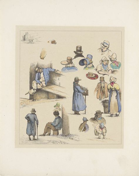 Curator: Christiaan Andriessen’s "Figuurstudies (zesde blad), 1833," a work combining pencil and watercolor, strikes me immediately in terms of its presentation of labor. How do you read its visual language? Editor: It feels like a snapshot of everyday life. A variety of people are depicted – some playing instruments, some carrying baskets, others just seated. I notice the consistent use of hatching and the simple application of color, it's mostly outlines with colour sparsely added. What stands out to you, thinking about this work in terms of its material making and context? Curator: What's fascinating is the artist's process. Consider Andriessen's choice to combine pencil sketches with delicate watercolors. The layering suggests a deliberate act of building up images. Given the context of 1833, how might we interpret these depictions of figures and everyday activities, perhaps even genre painting, in relation to the contemporary social landscape? Editor: Maybe it’s about class distinctions? Some figures appear to be working or selling goods, while others are simply occupying space, like the seated men. The details in the objects – the baskets, the musical instruments – seem significant, emphasizing certain activities over others. Curator: Exactly. The act of drawing itself becomes a form of labor. He meticulously documented the lives of the common folk. Think about the chairs - what's the meaning embedded in such common items? Are they uniformly built or reflecting diversity based on function and maker? Do we learn something by considering this work beyond the traditional notions of "high art?" Editor: That's a really interesting perspective! Thinking about it as a document of labor itself, and about the materiality of the subjects, gives it a new dimension. It definitely broadens its significance beyond just aesthetic appeal. Curator: Absolutely. The drawing compels us to recognize and value the representation of work, materials and labor in the everyday world, not just its artistic execution. A nice peek into a moment of history viewed in aggregate.