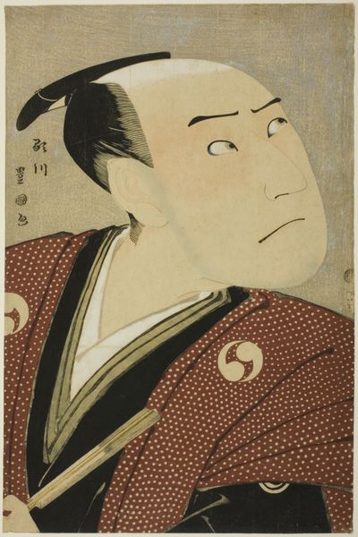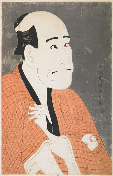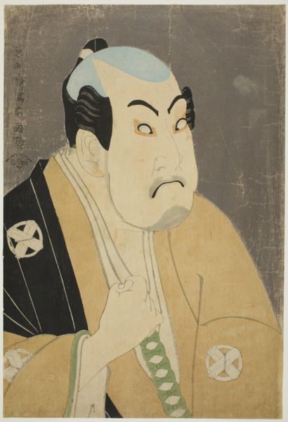 Editor: This is Tōshūsai Sharaku's woodblock print of "Actor Tanimura TorazÅ," portraying Washizuka Happeiji. The actor's intense expression is so striking. What do you see in this piece? Curator: The exaggerated features and stark lines reveal the actor's inner turmoil, resonating with archetypal struggles found in theatre across cultures. The symbolic weight of the costume hints at social standing and the complex morality of his character. Editor: That's fascinating; the symbols really add layers of meaning. Curator: Indeed. Consider how Sharaku captures a moment laden with emotional and cultural significance. Does it shift your perspective? Editor: It definitely does. Thanks for pointing out those symbolic connections.