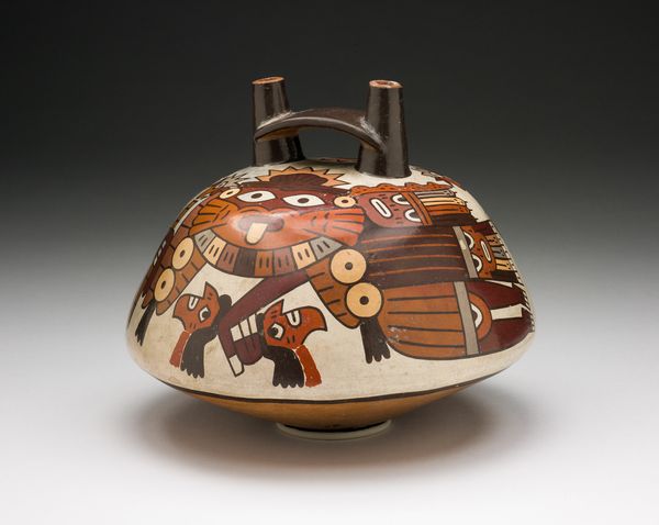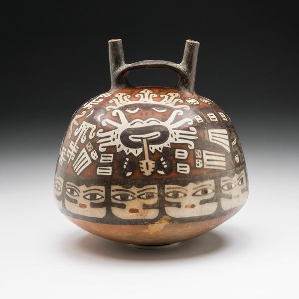 Curator: Look at this earthenware double-spout vessel dating from around 180 to 500 CE. It’s titled "Double Spout Vessel Depicting Ornamental Faces with Numerous Emanations" and was created by the Nazca people. Editor: Intriguing! My immediate impression is of a fierce protector. The faces and emanating designs suggest power and a somewhat unsettling aura. What can you tell me about its production? Curator: Well, this piece highlights the skill involved in creating earthenware vessels within Nazca society. The process itself—sourcing the clay, forming the vessel, applying slip for color, and finally firing it—demonstrates a complex understanding of materials and techniques, revealing much about resource management and craft specialization during this period. Editor: The faces are compelling. Notice the recurring motif of emanations surrounding the central figures, and the double spout as unusual features that feel deliberately symbolic. Do you interpret those as representations of spiritual energy or perhaps ancestors? Curator: It's possible. Iconography in Nazca pottery often relates to their cosmology and agricultural beliefs. Snakes coming out of the mouth, avian features around the central head may depict the intersection of natural forces in their worldview. It is a reminder of how cultures imbued functional items with symbolic weight. Editor: I'm drawn to the contrast between the vessel's function, potentially mundane, and the vibrant symbolism covering its surface. Do you see a relationship between artistic expression, societal roles and this vessel for ritualistic or practical use? Curator: Definitely. This blending blurs lines between functional craft and ritual object and it tells us a lot about how aesthetics, skill and materiality come together, which tells us a great deal about Nazca life. Editor: Reflecting on this remarkable piece, I'm struck by the layered symbolism—a fusion of power, spiritual resonance, and maybe a touch of unease—that continues to echo through time. Curator: And I am more impressed with Nazca artisan's mastery of materials to translate vision into lasting form, offering a compelling snapshot of ancient societal priorities.