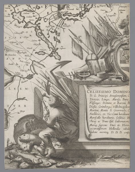 Curator: Okay, here we have Jacob Aertsz. Colom's "Kaart van het Graafschap Holland en Utrecht," dating back to 1639. Editor: This piece is amazing. I never thought maps could feel… jolly. It is so elaborately ornamented. The figure with the jug is funny and bizarre and catches the eye more than the geography does. It looks like organized chaos. What are your initial thoughts about this work? Curator: "Organized chaos"—I adore that! For me, this engraving dances between precision and imagination, it transcends mere cartography, don't you think? Notice how the formal map is almost battling for space with these bursting vignettes of everyday life, it's the booming Baroque embracing the burgeoning mercantile spirit of the Dutch Golden Age. Editor: It's a little overwhelming, to be honest. Where should my eye even land? I get that it's detailed, but what does it all *mean*? Curator: Good question! The overflowing abundance, it speaks volumes. Think about the power the map gives – of owning the land, viewing it, and claiming it. The Dutch were quite literally re-shaping the world and projecting authority in an artistic format with symbols of peace, nature and even leisure.. How interesting that it has survived so well into the present! The hat, instruments and the drink: Are we celebrating the land, or consuming it? Editor: Wow, I hadn't thought of it that way. It really turns the map into more than just a guide. Now the map *is* the message of Dutch ingenuity, control and…appetite. I'll never look at a map the same way again. Curator: Wonderful! And isn't it exhilarating when a static image begins to narrate stories beyond its lines and forms? Editor: Absolutely! This piece felt a bit overwhelming initially but contextualizing the art elements opens a broader insight into art and history!