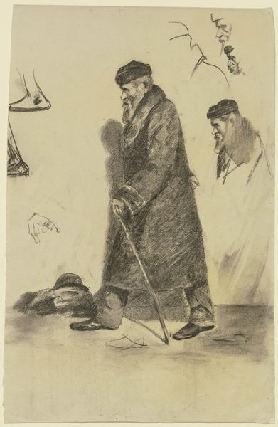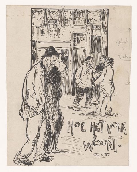 Jan de Waardt created this drawing, "Straatverkoper met bord 'Prachtige winterjassen sterk goedkoop'," using graphite on paper. The choice of graphite is critical here; it's a humble material, perfectly suited to capture the bleakness of the scene. Look closely, and you'll notice the contrast between the rough strokes used to depict the weary street vendor and the more defined lettering on the sign he carries. This speaks volumes about labor and class. The vendor, hunched and worn, is rendered with a raw, almost hurried technique, reflecting the daily grind. The sign, advertising "beautiful winter coats, strong, cheap," suggests mass production and consumerism. The drawing style reflects the social context of early 20th-century urban life, capturing the stark realities of labor and the relentless pursuit of commerce. By focusing on material and making, De Waardt elevates the street vendor's plight. It bridges the gap between fine art and everyday experience.