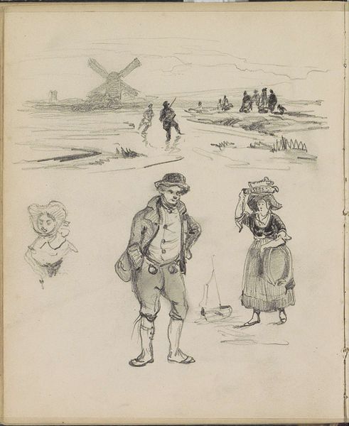 Willem Cornelis Rip created this understated pencil drawing, showing two men and a seated woman in a landscape. The apparent simplicity of this sketch belies the labor involved in producing art – even one so seemingly casual. Notice how Rip subtly varies the pressure of his pencil to create depth and texture, using lines to suggest the folds in clothing and the contours of the land. This speaks to Rip’s control over his materials, honed through years of practice. Consider also the social context of artmaking in the late 19th and early 20th centuries, when professional artists sought to capture everyday life. The drawing depicts a scene of rural labor, perhaps reflecting the artist’s own experience in portraying a particular time and place. The economic realities of the art world meant that artists often relied on commissions and sales to support themselves. Ultimately, this drawing reminds us that even the most unassuming artwork is the result of skill, effort, and the broader forces of society and economy.