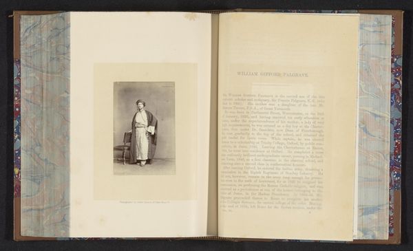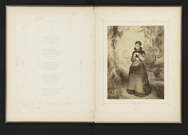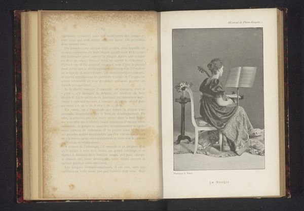 Editor: Here we have a page from Emile Pricam’s personal sketchbook, featuring an image entitled "Blanche Ollivier tijdens een scene uit Femme a Papa,” created before 1897, with watercolor and coloured pencil. I’m struck by how this staged photograph becomes almost dreamlike, especially given its context within what looks like a handwritten journal. What narratives do you think it evokes? Curator: That's a perceptive observation. Think about the act of placing an actress, embodying a specific female role, within a private, intimate space like a journal. How might that complicate our understanding of performance and identity at the time? Was Pricam deliberately blurring the lines between the private and public persona of women? Editor: So, by placing a photograph of Blanche Ollivier, a recognizable public figure in his time, within the intimate space of the journal, does Pricam perhaps want to emphasize that an actress’s identity on stage may be nothing like her true self off stage? Curator: Precisely. And we must remember the broader social and political context. Late 19th-century Europe was grappling with shifting gender roles and expectations. Actresses, in particular, were often viewed with suspicion, simultaneously celebrated and denigrated. How does situating Ollivier's image within this historical frame alter your reading of it? Editor: It definitely highlights the contradictions actresses faced, caught between admiration and judgment. So maybe Pricam is asking us to consider what it really meant for women to perform different versions of themselves. Curator: Yes, I think engaging with this historical tension around femininity opens the door to explore its lasting impacts on contemporary social narratives about female performers. By placing it inside a book, maybe Pricam is referencing or participating in shaping our cultural history, for those of the past as much as our present and our future. Editor: I see your point; understanding that background makes it clear the image can make an important historical commentary on the societal pressures felt by performers, women or not. It makes the sketch seem quite modern, actually. Curator: Absolutely. By examining how historical figures navigated issues of identity and performance, we gain insight into the enduring challenges surrounding representation, particularly for women in the public sphere.