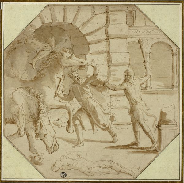 Editor: So, this piece is called "Over Door Panel" by Nicholas Amantea, likely made sometime between 1935 and 1942. It looks like it’s carved into wood and then colored, perhaps with colored pencils? The scene shows a figure on horseback facing a buffalo. What do you see in this piece, and what cultural story might it be telling? Curator: The pairing of the indigenous figure with the buffalo immediately calls forth themes of survival, respect, and the hunt, key symbols of many Plains cultures. Notice how both figures – human and animal – seem equally weighted in the composition, denoting balance, perhaps even symbiosis. Do you observe a feeling of dynamic tension or tranquil coexistence? Editor: I see both, actually. The spear implies tension, the hunt – but there’s a stillness too. I’m drawn to the frame with those star-like carvings... What does that add to our reading? Curator: Those decorative elements provide context and connection. The star motifs could be linked to specific tribal nations or ancestral connections, reminding us of the cultural memory embedded within seemingly simple ornamentation. The geometric frame shapes, contrasted against the organic forms, serve to organize a perceived worldview. Consider how it alters the experience for a viewer versus what would exist without it. Editor: That’s interesting – the geometric versus organic. It frames the story and maybe elevates its importance. Curator: Precisely. By focusing on symbols repeated over generations, we glean insight not only into artistic expression but cultural survival and worldview, despite decades of forced displacement. Editor: It really adds a layer of depth that I initially overlooked. Thank you! Curator: My pleasure. Cultural artifacts speak when we listen.