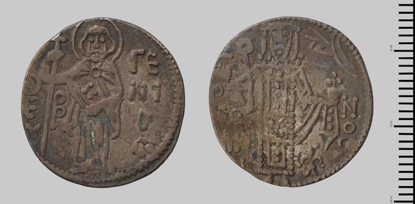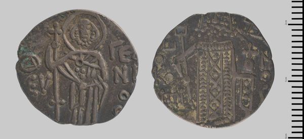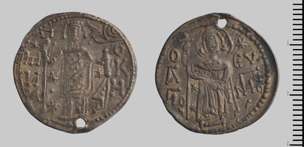 Curator: Here we have a coin, an "Asper of Manuel I of Trebizond," attributed to Manuel himself! What are your first thoughts? Editor: Well, immediately, it feels... well-worn. Like a piece of the past that's really *been* through something, you know? Curator: Absolutely. The imagery, though faded, speaks volumes. Notice the representations of figures, perhaps imperial or religious, imbued with symbolism. Editor: Those figures... they're almost like abstracted ideas of power, aren't they? The symbols are so dominant, it's like the coin isn't about individuals but about what they represent. Curator: Precisely. Consider, too, the potential cultural context. This coin circulated in a world steeped in Byzantine tradition, a world where images held immense sway. Editor: It's a small object, yet it feels enormous in its implications, like a tiny doorway into a lost empire. It makes you wonder about all those who held it, handled it... Curator: It certainly does. A tangible link to the past, and a testament to the enduring power of symbols. Editor: A silent witness, indeed.