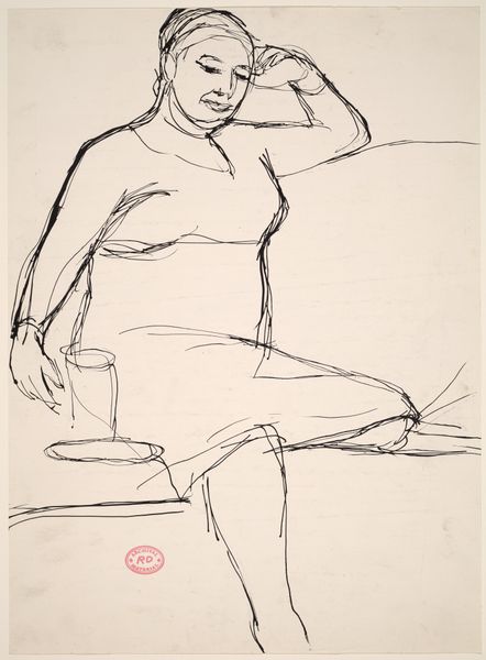 Curator: Richard Diebenkorn, known for his abstract expressionist beginnings and later shift toward representational art, created this drawing, “Untitled [standing female nude leaning on a support],” sometime between 1955 and 1967. The piece is a study in ink and pencil. Editor: She looks…tired. Exquisitely weary, even. The loose strokes somehow capture this universal feeling of being utterly done. I swear, I've struck that exact pose myself at least once this week. Curator: Indeed. The pose, and particularly the averted gaze, suggest a sense of introspection, perhaps even a commentary on the objectification of the female form throughout art history. By presenting her not as an idealized figure but as someone burdened by thought, Diebenkorn complicates the narrative. Editor: You're totally right about the objectification bit. The lack of distinct facial features feels intentional, right? Like she’s a stand-in for so many women, carrying the weight of expectations, of… simply existing. Curator: Exactly. And when considered in the context of Diebenkorn's broader body of work, particularly his figurative period, we can interpret this piece as a subversion of traditional artistic representations of women. Rather than focusing solely on physical beauty, he seems to prioritize psychological depth. Editor: I love that. The way the ink bleeds and blurs also contributes. It almost obscures her, adding another layer to this idea of being unseen or overlooked. And there’s something brave about the rawness of the lines. It makes me feel like he was more interested in capturing a feeling than a perfect form. It’s honest. Curator: Absolutely. Considering the time frame, it’s hard to ignore the intersectional feminist discourse developing then and its potential influence. What resonates is how the piece fosters a sense of empathy. Editor: Yeah. It reminds me that art, even a simple sketch, can be this really powerful conduit for connection, you know? Curator: A point well taken, illustrating art’s ability to ignite social and personal reflections. Editor: A pretty heavy moment, fueled by ink and a tired-looking muse. Definitely gives you something to ponder, right?