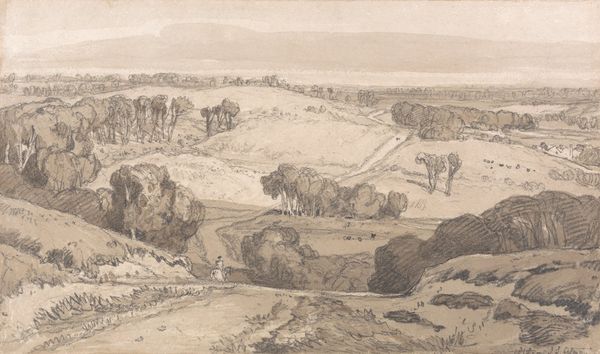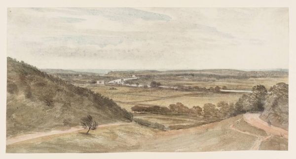 Curator: I'm immediately struck by the overwhelming sense of melancholic stillness. The muted palette and dilapidated aqueduct convey a feeling of profound loss and the passage of time. Editor: Indeed. We're looking at "Ruin of an Aqueduct on the Road to Cori, Italy" by Carlo Labruzzi. Though undated, Labruzzi lived from 1748 to 1817. It offers a glimpse into the Roman Campagna, a region laden with historical weight. Curator: That explains the aqueduct, an ancient symbol of Roman engineering prowess. Yet, here, it lies in decay, a poignant reminder of impermanence. What do you make of its setting? Editor: The rolling hills, the overgrown foliage, and the rough track emphasize the power of nature reclaiming human endeavors. These picturesque ruins are not merely aesthetic; they are a comment on civilization itself. Curator: It's as if Labruzzi is inviting us to contemplate the cyclical nature of history, where even the grandest empires eventually crumble into dust. Editor: Perhaps, by rendering this scene, he's challenging the viewer to look beyond the romanticized view of the Roman Empire and consider its ephemerality. It's a reminder that time marches on, indifferent to human ambition. Curator: Seeing this image is an invitation to acknowledge and maybe even find beauty in the transience of human endeavor. Editor: Absolutely. Labruzzi’s landscape leaves me contemplating the relationship between humanity's grandest ambitions and nature’s enduring presence.