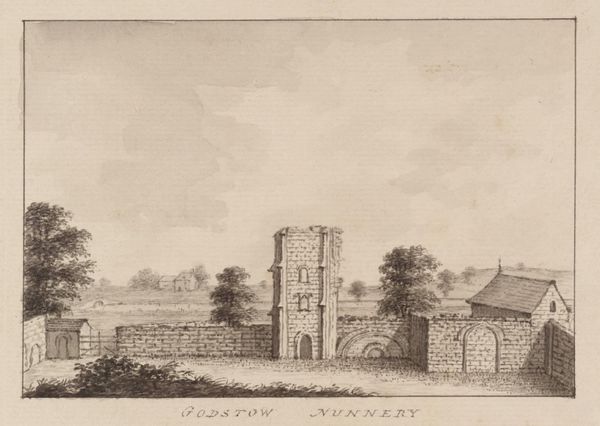 Editor: We're looking at Jan de Beijer's "The Ruin of Brederode," created between 1746 and 1748. It’s an ink and etching drawing on paper. The scene is quite serene, almost melancholic, with this imposing ruined structure dominating the landscape. What do you see as key visual elements within its composition? Curator: Initially, consider the careful articulation of line. De Beijer uses etching to create subtle tonal gradations, carefully modeling form and depth. The skeletal architecture is rendered in fine detail, evidencing the artist’s acute attention to linear structure. We observe how the linear structure interacts with the more softly rendered trees and the vast emptiness above. The ruined state becomes as much a visual element as the naturalistic portrayal. The contrasting balance between natural form and deliberate artificial form establishes interesting meaning when the artificial has broken down. Editor: The ruin does take center stage. Is the decaying nature symbolic? Curator: Thematically, yes. But let's examine that idea more carefully from a formal perspective. The vertical thrust of the ruined structure contrasts against the horizontal stretch of the landscape. How does that interplay contribute to the viewer's experience? Does it evoke an active response, perhaps stimulating our intellect with historical or allegorical reflections? Editor: It feels static in a way; somber almost. It emphasizes the weight of time, and it definitely feels intentional in the way the ruin mirrors the setting sun of that culture. Curator: Precisely. In de Beijer's work, we discern how formal relationships create profound emotive resonances. It makes me see the deliberate construction behind artistic design more intently. Editor: I appreciate you pointing out those opposing lines, between decay and progress. It adds depth to my understanding.