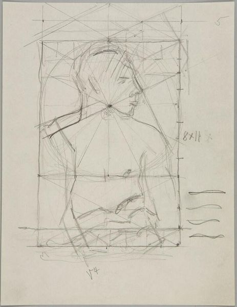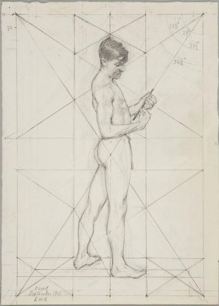 Curator: This study, from the Harvard Art Museums, is titled Seated Male Nude Leaning on his Left Hand. It was sketched by Denman Waldo Ross. Editor: The geometric shapes layered beneath the figure give it an architectural feel—like a Renaissance master's preparatory sketch. The figure itself feels pensive, almost burdened. Curator: Ross's geometric underpinnings are fascinating. The inscription, though faint, suggests an underlying structure based on the square root of eight. It speaks to a desire to find an ideal proportional system. Editor: Yes, the symbolic weight of those shapes—the circle, the square—suggests the figure is not merely a body, but also an idea, placed within a cosmic order. The artist is trying to tell us something beyond the nude figure. Curator: It prompts me to think about the historical construction of the male body in art. How does Ross’s approach either reinforce or challenge dominant narratives of masculinity? Editor: It’s a complex piece, isn't it? Something both intimate and universal. Curator: Indeed, a dance between the individual and the ideal.