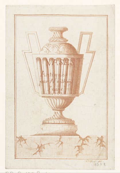 Curator: This is "Antieke vaas met deksel," or "Antique Vase with Lid," a print made by P. (l'ainé) Moithey in 1767. It's rendered as a delicate engraving on paper, exhibiting a distinct Neoclassical style. Editor: My immediate impression is one of understated elegance. The terracotta monochrome is beautiful, creating a kind of austere yet harmonious balance. Curator: Indeed. The print exemplifies Neoclassical ideals of order and clarity. Vase designs like this were deeply embedded in 18th-century visual culture, linked to ideas of civic virtue and the revival of classical aesthetics. The choice of depicting an antique vase was a direct commentary on the social and political values of the time. Editor: Absolutely, I find myself questioning whose values exactly. It looks to me that it is drawing on class and exclusivity. I find myself thinking about who possessed such decorative items. It would likely reflect their status and taste, especially amidst the burgeoning consumer culture of the late 18th century, no? Curator: Precisely. Think of the Grand Tour and the fashion for collecting antiquities, feeding back into the elite cultures of consumption. Moithey’s print almost functions as a catalog, showcasing designs to inspire patrons. These seemingly simple engravings are potent symbols of cultural capital. The very concept of "antiquity" was being constructed and commodified in this era. Editor: Looking closer, the lion-headed handles feel less refined and somewhat brutal against the otherwise pure geometric lines of the piece. And, that base makes the vase look unstable on what appears to be a ledge made of stone. I’m not sure the composition achieves an ideal I admire, personally. Curator: I appreciate that you picked up on the lion heads; they provide a fascinating glimpse into the complex semiotics of power and prestige during that time. I also observe an emphasis on line which reinforces the vase's geometric design but has implications to how those ideals took root within France. The emphasis that this movement made when reinforcing ideals through social reforms were ultimately rooted in white supremacy. Editor: Interesting, and something to keep in mind. Seeing art through multiple perspectives helps provide insight and broaden one's scope of how the viewer observes the artwork in its specific context. Curator: Well, considering Moithey's vase alongside social and historical frameworks enables a more profound connection to it as we question its function.