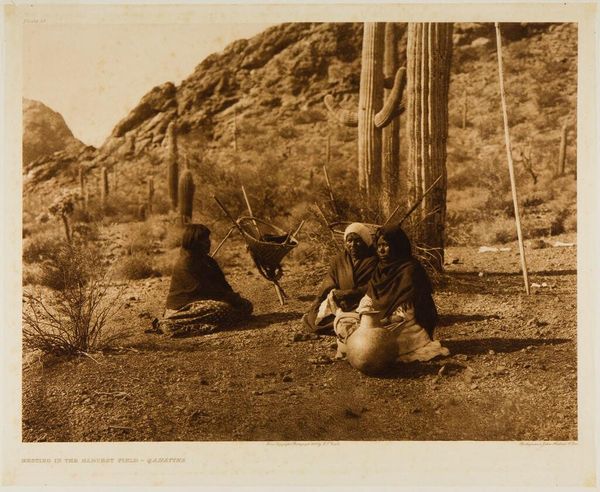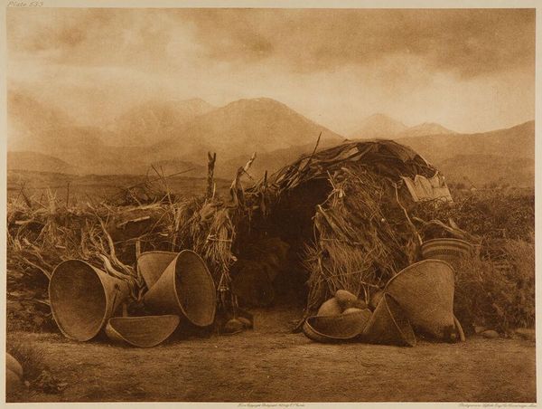 Curator: Edward Sheriff Curtis captured this image, entitled "Pima-Ki," during his extensive photographic work documenting Native American life. Editor: It feels incredibly still, a snapshot of daily life rendered in sepia tones, almost dreamlike. Curator: Curtis's work, particularly his use of platinum printing, offers incredible tonal range but also reveals the complex process of image creation and the control he exerted over his subjects. Editor: Look at how the structure mirrors the mountains in the background. The lines, the earth tones – the photographer seems interested in the contrast between human-made structures and natural forms. Curator: Indeed. The materials used for this dwelling speak to the resourcefulness of the Pima people and their engagement with the land. Editor: It's a testament to Curtis' artistry, even if we acknowledge the problematic colonial gaze through which these images were often created. Curator: Acknowledging that complexity allows us to more fully appreciate the image's visual power and consider the historical context. Editor: Yes, recognizing that tension makes the image resonate even more deeply.