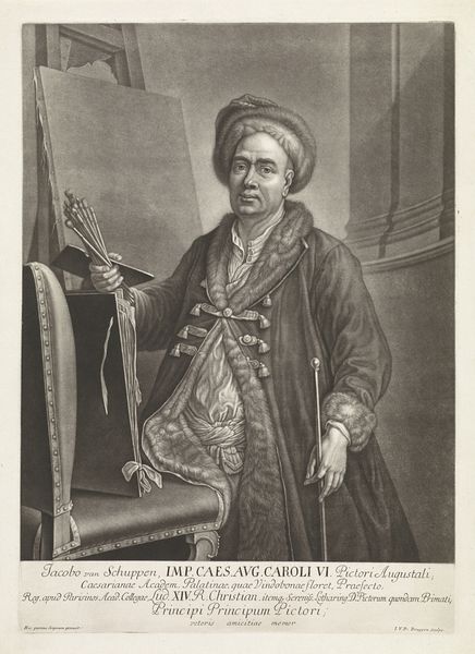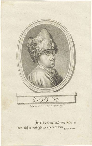 Editor: This engraving, "Cuchein Ollibeg, Persian Ambassador at Prague" by Aegidius Sadeler II, presents a portrait framed by text. What do you see in this piece beyond a simple depiction? Curator: It's a powerful statement about cultural exchange and representation. This image, created in 1601, exists within a specific socio-political context. How does the inclusion of Persian script challenge European-centric perspectives? It encourages us to consider the ambassador's own identity and agency. Editor: So, it’s not just about how Europeans viewed this ambassador, but also acknowledging his own cultural background? Curator: Precisely. It prompts us to decolonize our gaze and consider the power dynamics at play in portraiture. This challenges us to think about who controls the narrative and how different cultural perspectives are valued. Editor: That's fascinating. It really opens up a richer understanding of the artwork. Curator: Yes, recognizing these layers allows us to critically engage with the artwork's historical and contemporary relevance.