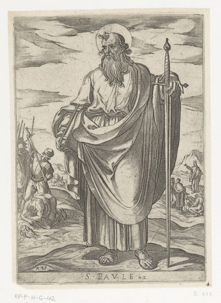 Editor: So, this engraving is called "De heilige Jakobus de Meerdere," or Saint James the Greater, made sometime between 1565 and 1630 by Antonio Tempesta. It’s at the Rijksmuseum. It has a strange and dramatic atmosphere for a saint, right? I mean, what's going on in the background? How do you interpret this work? Curator: The drama's definitely dialed up to eleven, isn’t it? Beyond the central figure of James, look closer, and you'll see little vignettes playing out. Executions, almost like miniature scenes from a play, unfolding in the background. Tempesta's almost throwing everything at us. Does that background feel…oddly disconnected to you as well? Editor: Totally! It’s like a collection of unrelated moments shoved together, a bit unsettling. Why frame this saint with violence? Curator: Well, the Baroque loved a good dramatic narrative, didn't it? Saints weren't just pious figures; they were protagonists in epic stories, often involving martyrdom. But there's a deeper tension, I think, between the serene, almost detached, expression on James' face and the chaos erupting behind him. Is he aware, accepting, or even indifferent to the suffering? It feels ambiguous. The choice to show not just his saintly nature, but also a hint of the turmoil surrounding faith—it gets you thinking, right? Editor: Definitely. It kind of forces you to question the whole idea of sainthood. So it’s not just a portrait, it’s a story… or many stories. Curator: Exactly. And like all good stories, it leaves you pondering long after you've walked away. This tension, this layered storytelling—Tempesta's really whispering something about faith, doubt, and the human condition, don't you think? Editor: I never would have seen that without you pointing it out. Now I see a depth beyond just a simple religious figure. Curator: Isn’t that the best part about diving into art? Finding those whispers and shouts we never expected.
