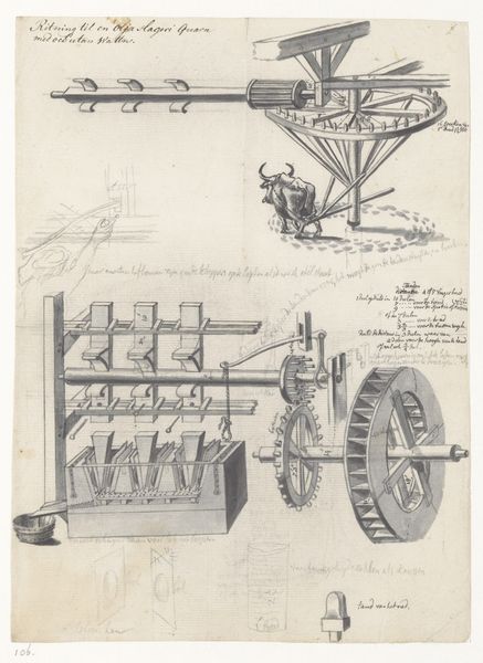 Here we see Cornelis Meijer's design for a one-person carriage, rendered with ink on paper, sometime in the 17th century. This isn't fine art; it's a technical drawing, a blueprint meant to guide skilled artisans in the construction of a carriage. The print meticulously illustrates each component, from the wheels and frame to the seat, even down to the individual screws and joints. The materials involved would have been wood, metal, and leather, each demanding specific skills to work. The image gives us a glimpse into the world of pre-industrial manufacturing, where skilled labor was paramount. The social context here is one of emerging technologies and transportation, tied to wider issues of class and mobility. The beauty of this piece lies in its directness and clarity, showing how design mediates between concept and physical reality. It reminds us that behind every object, there's a complex process of making.