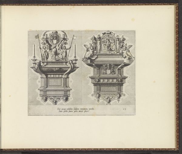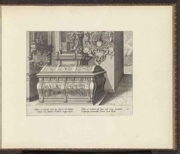 Curator: Let's examine this engraving from 1563 by Johannes or Lucas van Doetechum, titled "Grafmonument met leeuwenkoppen op consoles." It's a metal print depicting a tomb monument with lion heads, and it’s currently held at the Rijksmuseum. The overall feel to me is rather imposing. Editor: Yes, it certainly has a grand, architectural presence, doesn't it? Given its intricate design, what compositional elements stand out to you? Curator: The formal arrangement immediately commands attention. Consider the geometric clarity of the monument itself—its defined horizontal layers. The interplay of light and shadow, skillfully rendered through engraving, emphasizes the object's form and volume. The rhythmic repetition of the lion's heads introduces an organic motif, yet it is meticulously contained within a structured framework. The surface is so visually busy that one might describe it as a horror vacui. Editor: Horror vacui... I've never thought about a funerary object in that way, but you're right. Is this indicative of something at the time? Curator: The Renaissance was defined by complexity of form—decoration was employed on nearly every surface to draw one's attention and reward intense inspection. We find philosophical intent as well: a universe without voids is full of meaning, like life! Note how the monument is self-contained. It isn’t a direct reproduction, but rather an idealized construction meant to engage with forms alone. Editor: So, even in a piece about mortality, the Renaissance focus is on... life, or the intensity of experience? Curator: Precisely. Form, line, balance—these are elevated above mere representation. By engaging with them, we touch on something enduring. Editor: Thank you. I’ll certainly look at it differently now, focusing less on the subject and more on the visual construction. Curator: Indeed. The aesthetic choices are the very subject itself.