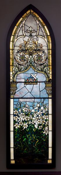 Curator: The translucency is immediately striking. Editor: Agreed. We’re looking at a detail of a stained-glass window titled "Jesus and the Samaritan Woman" from the Église Saint-Sulpice de Fougères. It's a work by Ludovic Alleaume, created in 1919. The artist employs the medium of glass with remarkable Art Nouveau and Symbolist sensibilities. Curator: Notice how Alleaume utilizes color—the turquoise foliage, pale mauve blossoms, the muted red column. They are strategically deployed within the black leading to create a vibrant yet strangely serene effect. The composition feels almost like a tapestry, abstracting the scene into decorative, interlocking shapes. Editor: And those interlocking shapes, that structure of lead holding each colored shard – it's about material resistance and the practical demands of holding this pictorial narrative aloft. The craftsmanship of this period elevated trades— glassblowers, lead workers, glaziers — into a respected artistic role. Were these local artisans, I wonder? The social fabric intertwined with the building’s decoration fascinates me. Curator: Undoubtedly. Semiotically, the foliage can also symbolize regeneration, a subtle nod perhaps to the spiritual cleansing offered in the biblical story, the color choices adding nuance. Notice, too, the flatness of the picture plane, characteristic of the Art Nouveau aesthetic. Editor: I’m curious about how this flat picture plane relates to notions of access and dissemination of these kinds of stories in a public setting – accessible because literally translucent. These churches played a vital role in distributing knowledge, influencing local economies through art commissions that sustained entire communities, especially post World War I like this one was. Curator: A compelling point, viewing religious institutions as both spiritual centers and drivers of economic and cultural production. Editor: In looking again at the floral patterns, a beautiful, albeit perhaps accidental, reminder that labor and artistry lie behind such an iconic story. Curator: Quite. The window’s inherent qualities do draw us to broader social histories. Editor: Always enriching.