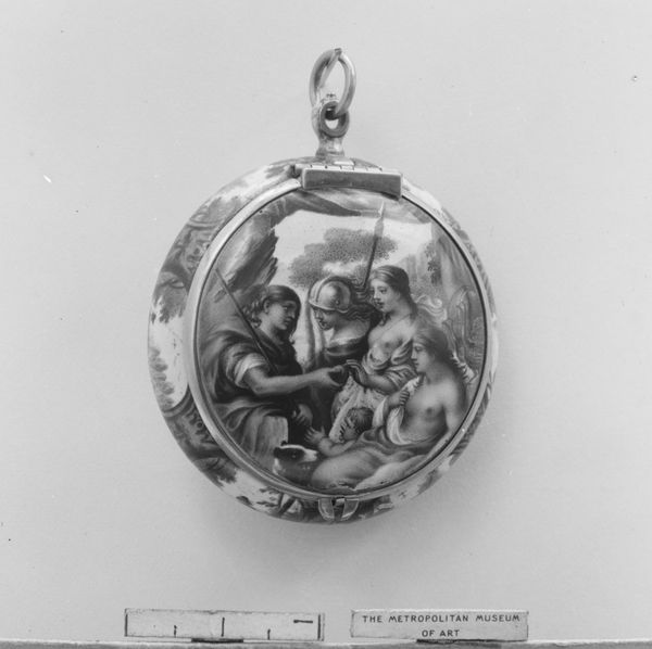 Editor: This is a fascinating object; a watch, crafted sometime between 1785 and 1799, made by Ferdinand Berthoud. The detail on such a small surface is really striking, particularly the figures inside the watch. What can you tell me about how its production and social context might influence how we view it? Curator: The materiality of the watch, its precious metals and delicate engraving, immediately speaks to a specific socio-economic sphere. Think about the labor involved: from mining the materials to the skilled craftsmanship required for its construction. Who had access to such objects, and what did it signify to own one? The rococo design is no accident: decorative details, miniatures, idyllic figurations; everything signals its time and place. How might this connect with a system of patronage and consumption of luxury goods in the late 18th century? Editor: That makes sense. So, it's not just about telling time, but also about displaying status. Were there particular artistic guilds involved, or specific techniques unique to watchmaking that elevated it from craft to art? Curator: Absolutely. The integration of various skills – goldsmithing, miniature painting, clockmaking – blurs those artificial distinctions. The meticulous process is worth focusing on, considering the repetitive nature and skill. Furthermore, the miniaturist inside indicates an intention towards art that rises above mere craftwork, but remains entrenched within materialist culture. Does the image displayed here depict leisure or power? Is this idyllic rendering itself also communicating something? Editor: I guess I had just considered it decoration before, but it's clearly speaking volumes about society and craft itself! Curator: Precisely! Reflecting on production, labor and the consumer context makes something as seemingly simple as a decorative miniature very telling. Editor: It certainly does make me appreciate not only the aesthetic value but the complex relationship between art and society. Thanks!