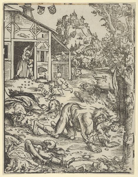 Editor: This engraving, "Zondvloed (linkerhelft)" by Nicolò Boldrini from around 1540, depicts a chaotic flood scene. I'm struck by the stark contrast between the vulnerable human figures and the looming, almost indifferent, landscape. How do you interpret this work, especially given its historical context? Curator: It’s crucial to consider this work within the context of Mannerism and the social upheaval of the 16th century. The bodies, arranged in these stylized, almost theatrical poses, speak to the anxieties of the time. Consider the Great Flood narratives - who is being purged, and what societal norms are being challenged by this act of God? Is this merely a historical depiction, or a commentary on contemporary corruption and sin? Editor: So you're saying that the figures' vulnerability is less about individual suffering and more about societal commentary? Curator: Precisely. And note how the "landscape" isn't just scenery. It’s an active participant, a reflection of divine retribution. Look at the ruins—they symbolize the crumbling of past civilizations, hinting at the cyclical nature of power and the potential for societal collapse. This was a time of great religious and political tension. What might that signify in terms of societal roles and moral responsibilities reflected through this flood? Editor: It's interesting to view it not just as a biblical scene, but as a critique of social structures through a Mannerist lens. Curator: Exactly. And the choice of engraving – a medium accessible to a wider audience – makes this social critique all the more pointed. It invites us to question power structures and our place within them. How might this narrative resonate in the context of contemporary climate change, where societal inequities exacerbate the impact of environmental disasters? Editor: I hadn't considered the connection to modern issues. It's amazing how much a 16th-century artwork can speak to present-day concerns about power and responsibility. Curator: Art is always in conversation with its present, recontextualized through ever-changing conditions and norms. Thank you for pointing out new layers for discovery!