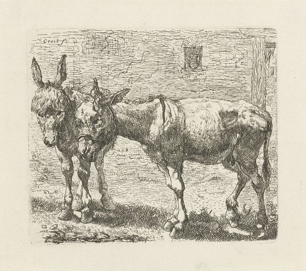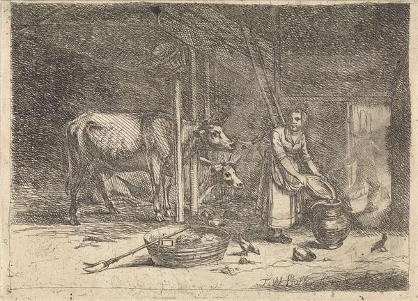 Curator: This is "Stalinterieur met twee paarden," or "Stable Interior with Two Horses," an etching by Christiaan Wilhelmus Moorrees. It’s believed to have been made sometime between 1811 and 1867. What do you think? Editor: Immediate impression? It feels intimate, even quiet. The light is subdued, almost secretive, filtering down on the horses. They seem calm, like old souls in a well-worn space. It’s a working space but not one without its beauty. Curator: Precisely! Moorrees uses etching to give us this genre scene that's rooted in Realism, presenting rural life without romanticism or harshness. It's like he invites us to witness a commonplace scene and, within that space, capture these moments. Editor: The composition’s interesting too. Your eye travels from the horses and then upward to the loft, with the hay and the barrel. Then down again, past the groom… It creates this looping journey, mirroring perhaps, the cyclical nature of farm life. There is definitely a connection between humans and the animals present in this print, Curator: Yes, it's a dance between the domestic and the animal, all held together by the space. And what’s crucial here is seeing this within its historical context. Realism emerged, partly, as a counter-narrative to the pomp and circumstance of academic painting. Images like these shifted attention, focusing instead on everyday experience. Editor: And that resonates even now, doesn’t it? The quiet dignity of labor, the interdependence... You know, it’s fascinating how an image rooted in a specific time can transcend it. I mean, those horses feel present, even timeless. Curator: Well, I think that’s the power of Realism, when it’s done with such evident care and attention to detail like it is in this etching, isn’t it? Making the ordinary glow. Editor: Exactly. Makes you want to wander into a stable, doesn’t it? Curator: Indeed, It does offer more than just art history; it’s more like a vicarious encounter.