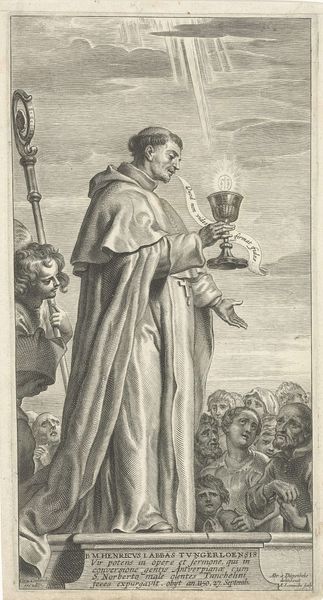 Paulus Pontius made this print of H. Norbertus sometime around the mid-17th century, a period defined by religious and political conflict. Here, Norbertus, a Catholic saint, is on his knees, almost in supplication, as angels hold a monstrance above him; this vessel would have contained the consecrated host, understood to be the body of Christ. Pontius's print exemplifies the role of religious imagery in shaping identity and belief during the Counter-Reformation. Consider the context: the Catholic Church sought to reaffirm its authority, deploying art as a powerful tool. Prints like these weren't just devotional aids, but also propaganda, aimed to inspire faith and loyalty amidst the religious wars tearing through Europe. The emotional intensity is palpable, designed to move the faithful and reinforce religious doctrine, and establish what it means to be a 'true' believer. This print encourages viewers to internalize these values, but also invites us to reflect on the power dynamics inherent in religious representation.