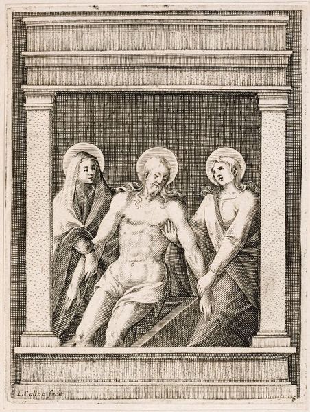Editor: This is Jonas Umbach's "Ecce Homo." The etching looks incredibly detailed for its size, especially the rendering of the fabrics and skin. What strikes you about the means of production here? Curator: Consider the economic and social context of printmaking in Umbach's time. The labor involved in creating the plate, the availability of materials, and the intended audience—how do these shape our understanding of the image and its function as a reproducible commodity? Editor: So, it’s not just about the image, but also about who could afford it and how it was circulated? Curator: Precisely! The materiality of the print, its accessibility, these factors democratize religious imagery in a way painting couldn't. Did Umbach intend this as a devotional tool? Editor: That gives me a lot to think about regarding the print's place in society. Curator: Indeed. It’s about art not as isolated object, but as a product of its time.