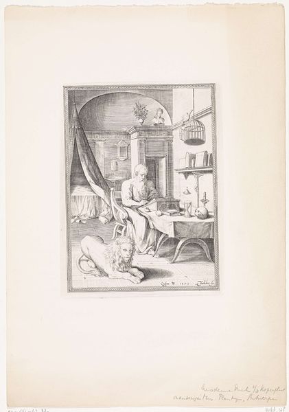 Curator: This is André Louis Victor Texier's "Alchemist's Laboratory," housed at the Harvard Art Museums. Editor: What a fantastically cluttered space! It’s like a brain bursting with ideas, rendered in monochrome. Curator: The composition certainly emphasizes the density of the scene. Note the strong contrasts of light and shadow creating a sense of depth and intrigue. Editor: The light seems to pool around the figure, drawing us into their concentrated world of study and experimentation. I almost feel like I could smell the old paper! Curator: Indeed, that play of light also serves to highlight key elements within the scene, guiding the viewer's eye through the complex arrangement of objects. Editor: It's that tension between order and chaos, the scientific mind wrestling with the mysteries of the universe, that really resonates. Curator: A well-observed point. It encapsulates a whole era of thought. Editor: Leaving me pondering the possibilities!