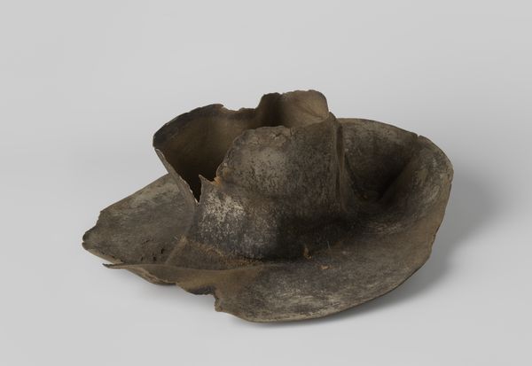 Editor: This is an oval hat box, created around 1910 by A.F. Herbermann. It's made with mixed media, largely paper and assemblage techniques, with a wood-grain imitation. The royal Dutch coat-of-arms is pasted on top, and the box itself follows an Art Nouveau style. There’s a kind of quiet elegance to the materials despite being a bit faded. What draws your attention when you look at this piece? Curator: Immediately, the faux-bois finish strikes me. It’s a conscious act of simulation, an attempt to elevate a common material—paper—through imitation. This box appropriates the visual language of wood, a material traditionally associated with quality, stability and craft. What purpose does this strategy of mimicry serve, and what are the semiotic implications? Editor: I suppose it speaks to the aspiration for a certain status, using affordable material to give off the impression of wealth or quality? Curator: Precisely. And look at the royal coat-of-arms. Its presence adds another layer of meaning. By incorporating a symbol of authority, it further reinforces the aspirational qualities of the piece. The artist plays with signifiers of value—natural materials, noble connections, historical reference, through a highly synthetic construct. It makes one wonder about the object’s intended market, or consumer. How are these symbols composed and combined, and what message do they produce? Editor: It's a clever subversion of expectation. So, looking beyond just "pretty decoration", it becomes a commentary on consumerism and status? Curator: One could certainly make that argument. Its deliberate manipulation of materials and symbols compels us to question our assumptions about value and authenticity in art and commerce. Editor: I see now that focusing on material and structure is about more than just surface appearance - it really reveals the ideas the artist explores. Curator: Indeed. Considering all of this offers a way to view art as an instrument for expressing meaning that resonates with our cultural values.