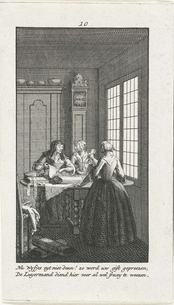 Curator: This is "The Occupations of Women: Sewing" by Daniel Nikolaus Chodowiecki. It is an engraving at the Harvard Art Museums. Editor: It's got this almost dreamlike quality, despite the everyday scene. Makes me think of quiet afternoons, secrets whispered over embroidery. Curator: Considering Chodowiecki's era, these "occupations" were deeply tied to societal expectations, limiting women's roles. The act of sewing becomes a symbol of domestic confinement. Editor: But maybe there's a quiet rebellion there too? A creative space carved out within those limitations? I love the light coming through the window--such a simple yet powerful moment of hope. Curator: Precisely! The composition invites us to consider the complexities of gender, labor, and artistic expression in 18th-century society. Editor: It's funny, I came in thinking "quaint," but I'm leaving with a whole tapestry of thoughts!