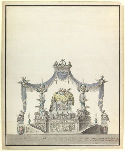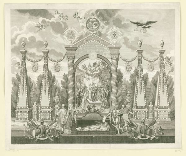 Jan Gerritsz. Visser created this drawing in 1788 as an allegory celebrating the King of Prussia's role in restoring Willem V to power. It gives us a glimpse into the tumultuous political landscape of the Netherlands at the end of the 18th century. The drawing depicts an elaborate scene filled with symbolic figures. It reflects a society grappling with questions of power, legitimacy, and national identity. Willem V's restoration was not merely a political event; it was a moment laden with ideological tension, as the old order clashed with emerging ideas of democracy and self-determination. The figures in the foreground represent the different factions and the complex dynamics of the time. The drawing invites us to consider whose voices are amplified and whose are silenced in the narratives of power. What does it mean to memorialize such a politically charged moment? How does this artwork shape or reflect societal issues?