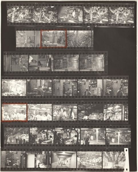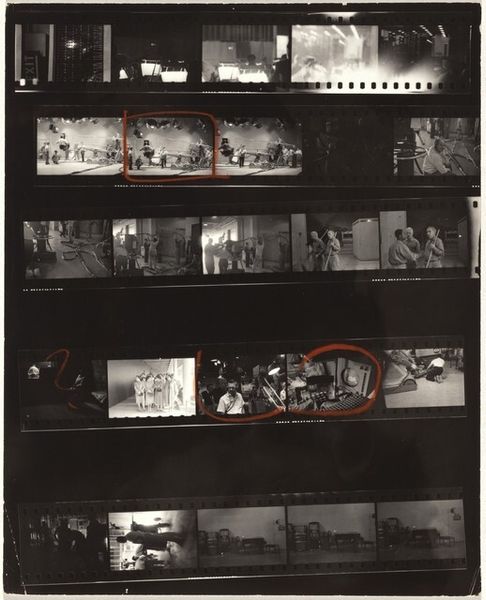 This is Robert Frank's photographic contact sheet of the Twentieth Century Fox film studio in Burbank, California, made with film, naturally. What strikes me is how Frank presents the film-making process itself as the subject, laying bare the means of production. The textures and tones are so rich, black and white with these halations of light. The way the images are arranged on the sheet, it's like a map of the scene. The individual frames each offer a slightly different perspective, giving you this fractured, Cubist view of the whole process. My eye is drawn to the frame marked with the red square. It highlights the behind-the-scenes nature of movie making. Frank's work, much like that of Walker Evans, highlights the often overlooked aspects of American life. And just as Andy Warhol embraced the silkscreen as a means of exposing the mechanics of image production, Frank embraces the rawness of film to capture a moment.