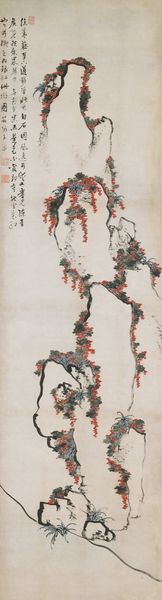 Lan Ying painted "Red Friend" on paper, in the late Ming Dynasty. The composition immediately draws the eye upwards, following the vertical thrust of the rock. Ying skillfully employs ink washes and carefully placed lines to define the contours and textures of the stone. The rock, riddled with holes, stands as a testament to time. The artist uses the formal elements to explore space and void, the solid and the ethereal. The stark contrast between the defined edges and the soft interior shading lends the rock a palpable, almost sculptural, presence. The use of red subtly vivifies the stone, hinting at an inner vitality. Through his composition, Ying transforms a geological specimen into an object of contemplation. Notice how the verticality of the scroll emphasizes the rock's soaring, aspirational form. This upward movement invites a metaphorical reading, aligning the viewer's gaze with ideals of transcendence and spiritual refinement.