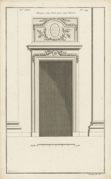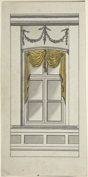 Editor: Today we're looking at "Vægdekoration i det blå kabinet med dørparti" - Wall Decoration in the Blue Cabinet with Door Section – a watercolor drawing from the late 1700s by Nicolai Abildgaard. It has a kind of stage-set quality to it. What is the effect of this composition, its symmetry, and colors? Curator: Indeed. The bilateral symmetry, coupled with the recession into depth created by the door, produces a feeling of balance, though the effect is also one of a slightly uncanny formalism. Consider the tonal relationships: the high-key pinks and blues create contrast and visual excitement. This heightened palette speaks to Abildgaard's engagement with Neoclassical aesthetic principles that demanded harmony and clarity in form and color. Editor: Neoclassical principles… Can you expand on that a bit? What features here speak to those ideas? Curator: Observe how the verticality is created by these perfect clear architectural details which frame the door itself; furthermore the restrained yet ornamental features demonstrate this sense of clear, elevated expression and timelessness often desired by neoclassical artists, what do you see as being Abildgaard’s emphasis, based on its pictorial construction? Editor: Well, given how he positions the columns at the front of the plane, maybe surface and artifice over realistic depth? Is this decorative intention emphasized by his use of watercolor? Curator: Precisely! The materiality and flat application of the watercolor enhance the drawing’s two-dimensionality and the color relations over representational depth. The ornamentation above the door echoes the urns, furthering a decorative through-line. The sky and vessels, appearing almost like an afterthought atop the solid doorframe, reinforces this dialogue between reality and illusion. Editor: I see now. It’s like a play with surfaces and expectation. I really appreciate how you clarified those color and structural relationships. Curator: Yes, observing those tensions provides so much information about how we come to understand the image.
