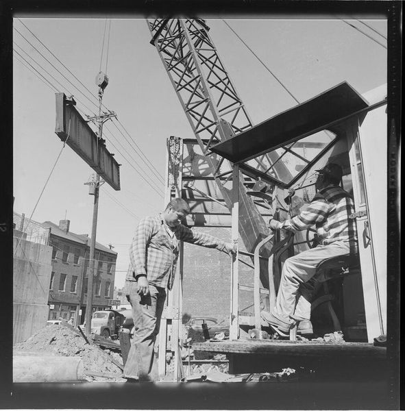 Editor: This photograph by Jack Gould, titled "Untitled (construction of town plaza; man surveying land in front)" captures a moment in time, frozen in black and white. The stark contrast immediately draws my eye to the geometric shapes of the crane and the surveyor's equipment. What compositional elements strike you? Curator: The photograph presents a compelling visual dialogue. Observe how the rigid geometry of the crane contrasts with the organic forms of the excavated earth. Note also how the photographer has employed a high-contrast palette to delineate form and texture. How do these elements contribute to the overall dynamic? Editor: I see how the contrast emphasizes the tension between construction and nature. It's as if the mechanical is intruding on the organic. Curator: Precisely. The visual structure reinforces the thematic content. Consider the interplay of light and shadow; these are not merely aesthetic choices, but integral components of the photograph's meaning. Does this suggest any further interpretations to you? Editor: It does! I hadn't considered how light shapes meaning. I'll definitely pay more attention to those elements. Curator: Excellent. Close visual analysis is the key to unlocking deeper understanding.
