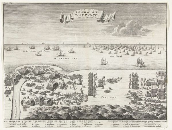 Editor: So, this is "Landing of Troops," an engraving with watercolor from 1770 by Paul Revere. It has an illustrative quality; it almost feels like a map more than a… history painting? What do you see in this piece in terms of its formal elements? Curator: It presents an intriguing study in the application of line. Notice how Revere utilizes line not only to define form but also to delineate planes and spatial relationships within the composition. Consider the almost diagrammatic representation of the ships. Editor: Yes, the ships and the town feel very precisely outlined. There is a lot of detail, and yet the whole thing feels very flat. Curator: Precisely. The flattening of perspective, a deliberate artistic choice, directs our attention to the surface—to the interplay of linear elements against fields of muted color. Look closely at how color is used sparingly. Editor: It looks like the red of the soldier’s coats and the flags create a clear pattern throughout. Is it a way of creating movement and visual interest? Curator: Certainly. This creates a rhythmic cadence, leading the eye across the scene, which brings us back to line again. Note how each repetition contributes to the engraving’s overall structural coherence. Are the slight colour variations between prints noteworthy here, considering Revere's status? Editor: Good question! The way Revere uses lines and color really highlights the structured nature of the scene, despite its historical context. Thanks for helping me see that! Curator: My pleasure. I've become increasingly aware of how formal analysis sheds light on an artwork’s essence.