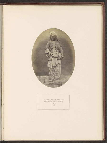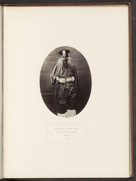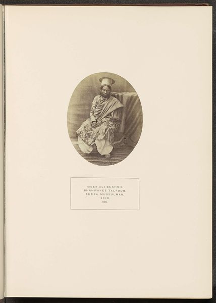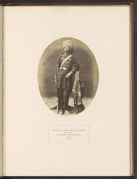 Editor: Here we have Henry Charles Baskerville Tanner’s photograph, "Portret van Wazeer Khan, een korporaal in het eerste Baloch regiment," created sometime before 1872, using the albumen print process. What strikes me is the sitter’s confident gaze, a defiance that seems to push back against the formality of the portrait itself. What do you see in this piece? Curator: The tension you’re picking up on is really crucial. Consider that this photograph was produced during a period of intense British colonial expansion in the Indian subcontinent. These photographic portraits were often tools of empire, meant to document and categorize people deemed ‘exotic’ or ‘other’. But look at Wazeer Khan's direct stare. Does it seem to comply with that colonial gaze? Editor: Not really, it almost feels… rebellious? Knowing the history, it's easier to read that in his expression, and maybe even his pose, which is stately but not submissive. Curator: Exactly! The "orientalism" tag is worth unpacking too. It describes the way Western artists and photographers often depicted people from the East through a lens that exoticized and, frankly, misrepresented them. So how can we view a portrait like this critically? Editor: We need to ask whose perspective is being privileged? How does the photograph participate in broader narratives of power and representation? And perhaps most importantly, does Wazeer Khan retain some agency in how he is being presented? Curator: Precisely. Thinking about identity, power, and representation – those are our key lenses. This single image can become a starting point to consider larger histories of colonialism and the power dynamics inherent in portraiture. Editor: I hadn't considered the photographer’s role in perpetuating those dynamics, or conversely, the subject's agency. Thanks! Curator: Absolutely. Thinking about these aspects allows us to delve much deeper into what a seemingly straightforward historical image is telling us.