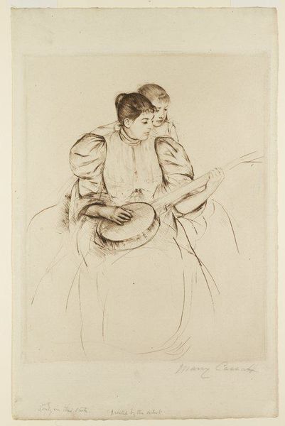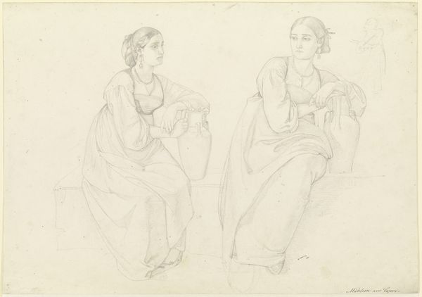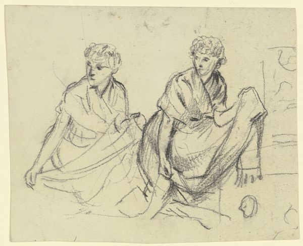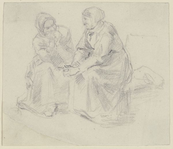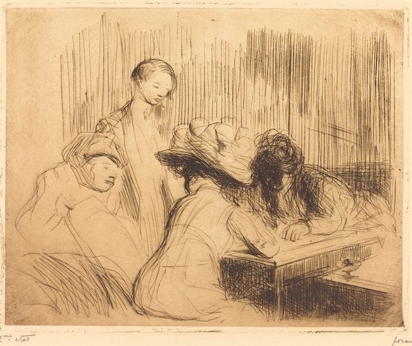 Curator: This drawing from 1858 is titled "Couple seated at a table," created by James Abbott McNeill Whistler using pencil. What is your initial impression of this seemingly simple piece? Editor: Stark simplicity! There's a poignant loneliness about these figures, rendered with such spare lines. The starkness is intensified by the subjects' enclosed space and inward focus. It speaks to constrained roles, like captured moments in an attic novel. Curator: I agree about the implied narrative tension, and it’s noteworthy that Whistler utilizes an academic-art approach to capture their essence. Consider the composition: the table acts as a strong horizontal plane, dividing the pictorial space, while the figures occupy distinct zones within it. The balance he strikes through this division is compelling. Editor: And the hat—what symbols! This seemingly oversized and sketchily-rendered hat dominates one side. Hats throughout history represent social identity, even status, here, a symbol that alludes to self-consciousness or societal conformity. One wonders what this conceals, culturally or even emotionally. Curator: Excellent observation, although Whistler leaves enough unsaid through suggestive strokes to maintain openness. Look at how he uses hatching and cross-hatching to suggest volume and depth, yet leaving certain areas deliberately vague and open to interpretation. This economy of line emphasizes the flatness of the picture plane. Editor: The woman’s bonnet, versus the other's bold hat, also whispers about power dynamics between genders in Victorian society. But their seated stillness emphasizes restraint. One wonders, are they waiting for someone? Discussing secret affairs? Their shared space amplifies those mysteries, as symbols. Curator: A very insightful consideration of Victorian symbolic vocabulary, though as a Formalist, I am hesitant to assign too literal an interpretation. Focus more directly on the quality of lines, their interaction, to reveal tension and structure. Ultimately, the sketch shows the artist’s understanding of perspective. Editor: Ultimately, perhaps both our interpretations offer another look. As you focus upon balance, I contemplate the weight of unacknowledged social expectations – each approach helps to enrich engagement within the art itself.