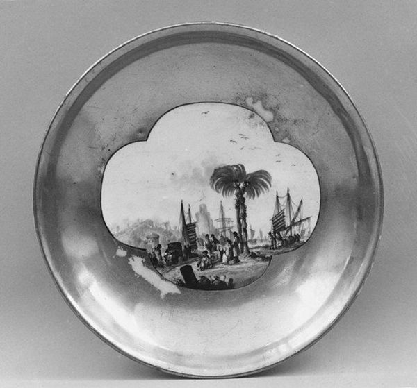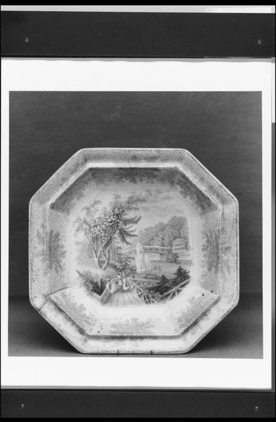 Curator: Welcome. Here we have a ceramic Platter made sometime between 1837 and 1857 by William Ridgway & Co. in Staffordshire, England. It uses earthenware with printed decoration, now residing here at the Met. What’s your initial read? Editor: Stark. A certain austerity. Even though it's a landscape, that monochromatic rendering and the sharp geometric form of the platter give it an almost graphic quality. What’s interesting about the choice to put this particular landscape on a piece of tableware? Curator: It certainly invites contemplation beyond mere utility. We need to understand Staffordshire pottery in the context of 19th-century British industry and colonialism. Landscape imagery, mass-produced on functional objects, reflects the Victorian era's evolving relationship with both the domestic sphere and the wider world, subtly perpetuating specific ideas around progress, taste, and even empire. Editor: And the symbols, I notice that mountain range repeats—the imagery seems designed to conjure the sublime; those almost theatrical peaks mirroring each other across a stretch of water. Are we meant to read those peaks as symbolic of a sort of challenge, or even mastery? Curator: Potentially. The mountainous landscape motif does indeed represent more than just picturesque scenery. It signifies the conquering of nature, the imposing geometry perhaps further reiterating claims to land. Further research on printed landscapes of the time could illuminate specific ideologies perpetuated through decorative imagery. Editor: So even a humble platter becomes a stage. And its geometric design and clean lines really strike me—something about that intentional choice stands out. A blend of artifice and nature is on full display here. The crack traversing its corner almost tells the story of inevitable fractures, literally in this instance! Curator: Precisely. Its material vulnerability complicates any assertions of steadfast stability or control implied by its scene and period of production. A telling sign, I'd say. Editor: Yes. And that print process of replication creates an illusion of access; the ability to transport a distant world directly into someone's home. Well, this has given me plenty to chew on. It goes to show, really, that you never quite know where a platter might take you! Curator: Indeed. This seemingly simple object offers a lens through which we may scrutinize history, technology, gendered spaces, and imperial visions—truly quite a full serving.