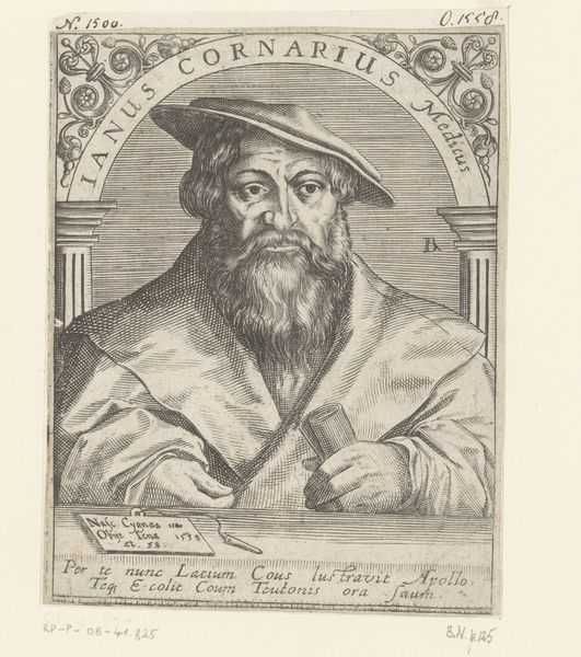 Editor: This is a piece titled "Portret van Heinrich Röust," created sometime between 1665 and 1712 by Johannes Meyer II. It's an engraving. There’s a solemn feel to it; a man captured in a very formal setting. What stands out to you the most when you look at it? Curator: Ah, Johannes Meyer! This print whispers of a time obsessed with immortalizing their civic leaders. The way the light etches into Röust's face suggests not just age, but perhaps a hint of weariness – the burden of leadership, no? It feels staged, grand… a performance, almost. Editor: A performance? How so? Curator: Think about it. The elaborate frame, the Latin inscription trumpeting his virtues… It’s all constructed to project a certain image. Even his gaze seems carefully calibrated. Does he look like a man, or an ideal? It's less about him as a breathing human, more as a symbol, a pillar of his city. Notice that the face and lace look especially crisp and contrasted, compared to the darker hat and robe. Editor: I hadn’t thought about it that way, seeing it more like a straightforward record. But I see your point – everything is working to create an image of power and respectability. Curator: Exactly! But don't let the initial impression fool you. Underneath all the polish, you catch some glimmers of personality in the work itself. The artist did have a good knowledge of printmaking since the person appears more defined than his adornments. Editor: That is very interesting. It’s amazing how much these kinds of images reveal about the era. Curator: Absolutely. This small etching holds so many stories, if you let it.
